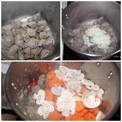 En la olla rápida ponemos el aceite y sofreímos la carne, cuando esté dorada añadimos la cebolla y el ajo picaditos. Cuando estén pochados añadimos el pimiento rojo y el tomate troceados, añadimos los champiñones en láminas y las zanahorias en rodajas. Por último añadimos el jamón.