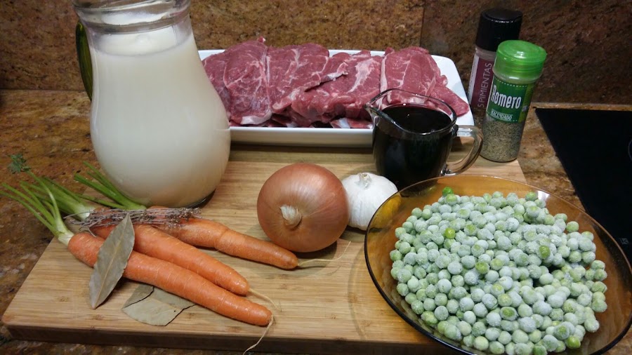 2 kg de ternera en filetes, 1 cebolla, 2 dientes de ajo, 2 zanahorias, 1 ramita de romero, tomillo, 2 hojas de laurel, 300 gr de guisantes, 1 vaso de vino tinto de los de agua, 1 litro de caldo de pollo, aceite de oliva, pimienta negra molida y sal.