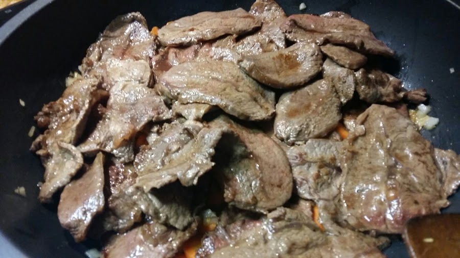 Cuando la verdura toma color, añadimos de nuevo la ternera.