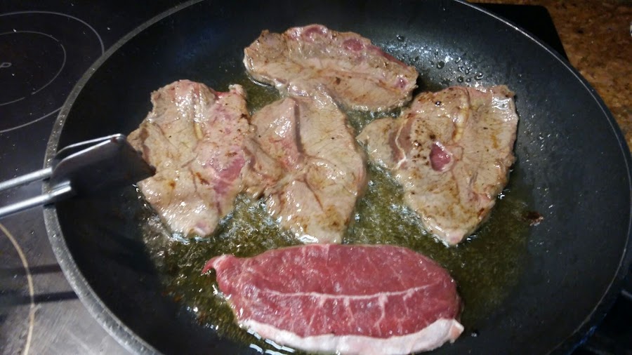 Ponemos una sartén al fuego con un poco de aceite de oliva, salpimentamos la carne y la sellamos.
