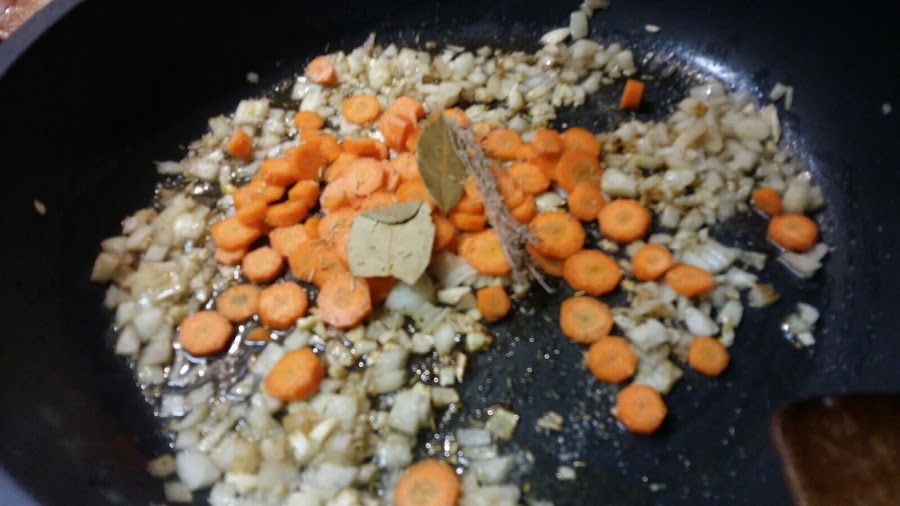 En el mismo aceite, rehogamos la cebolla con el ajo y cuando toma un poco de color, pelamos y añadimos la zanahoria en rodajas, el laurel y el tomillo y el romero.