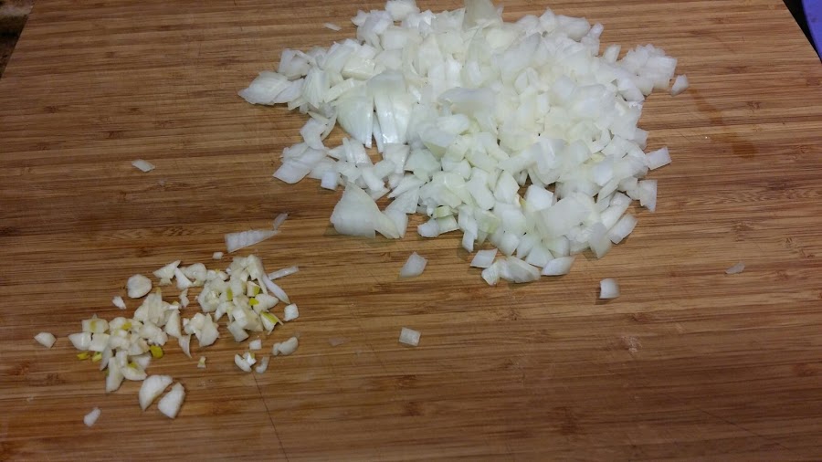 Cortamos la cebolla en brunoise (trocitos pequeños) y el ajo también.