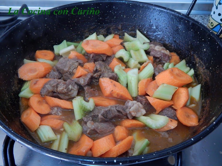Ahora incorporamos el tomate y cuando reduzca, la carne con una cucharada de harina, y el pimentón. La doramos y añadimos el vino y el brandy. Dejamos reducir un par de minutos, y añadimos agua hasta cubrirla. Ponemos la zanahoria y el apio. Espumamos unos minutos, salpimentamos, especiamos y dejamos reducir, hasta que se nos quede blanda la carne y la salsita espesa. Iremos añadiendo agua, según nos pida el guiso.