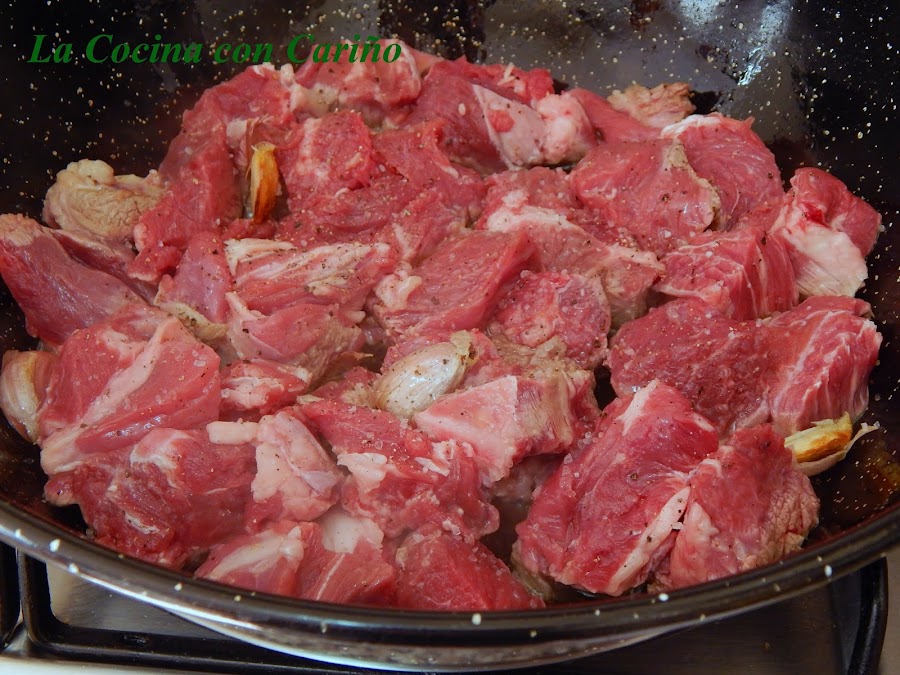 Inicialmente salteamos la carne salpimentada hasta dorarla para sellarla. Apartamos y en ese mismo aceite comenzamos rehogando los ajos laminados o machacados, como queráis. Cuando empiecen a dar olor, ponemos el laurel, los clavos y la cebolla, con un poquito de sal para que sude. Así a fuego medio hasta que esté transparente.