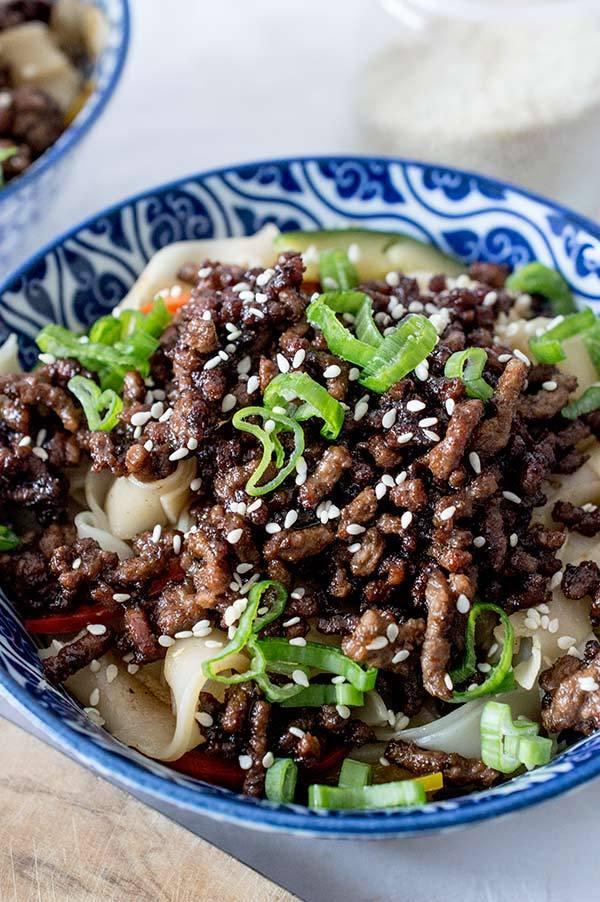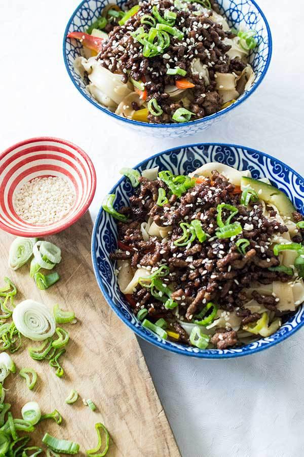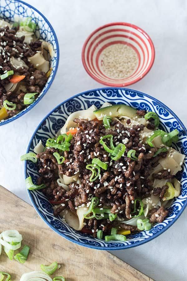 Servimos en un bol los tallarines de arroz y por encima la ternera estilo coreano! Ya veréis que sabroso esta.