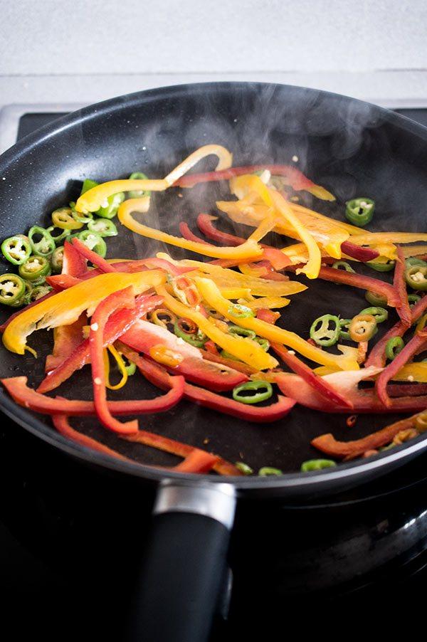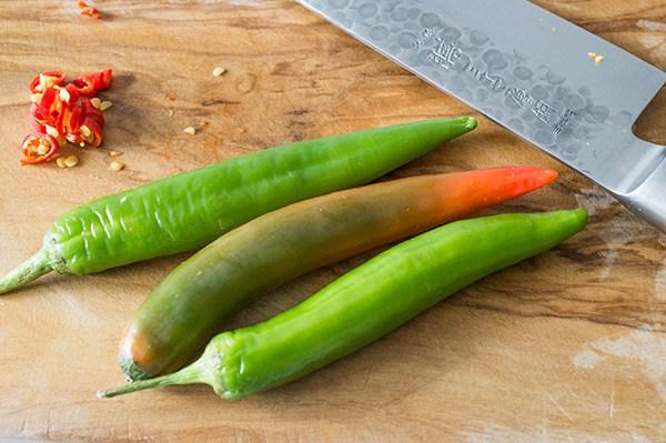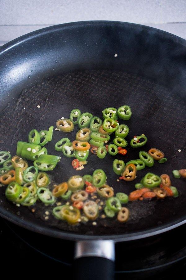 Picamos las guindillas verdes y los añadimos a la sartén con un poco de aceite de coco.
