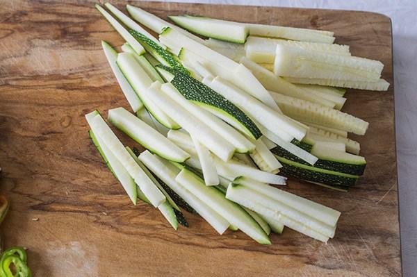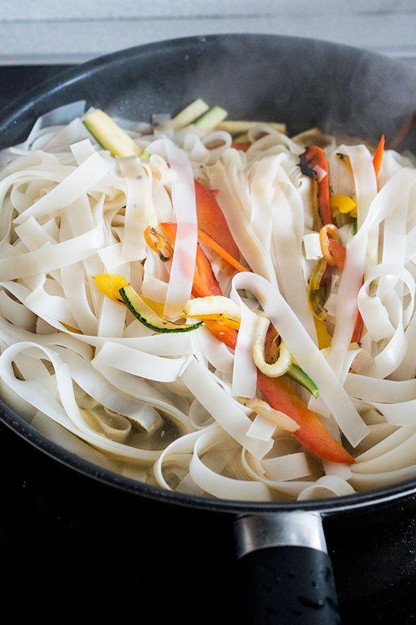 Cortamos el calabacín y salteamos también junto con el resto de verduras. Añadimos los tallarines escurridos.