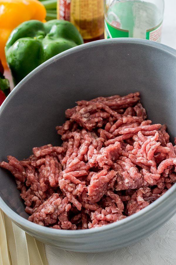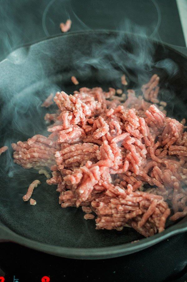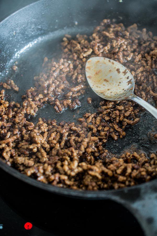 En la otra sartén salteamos la carne picada con nada de aceite.