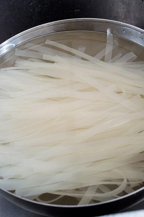 Lo primero de todo ponemos los tallarines a remojo en agua tibia.