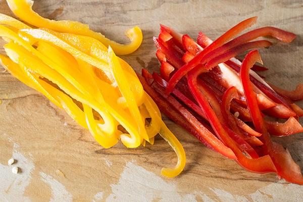 Cortamos los pimientos en titas y los añadimos a las guindillas.
