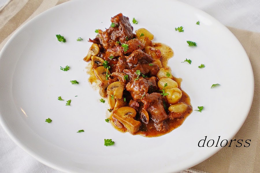 Ingredientes para 5-6 personas:1 kg de carne de ternera cortada a dados