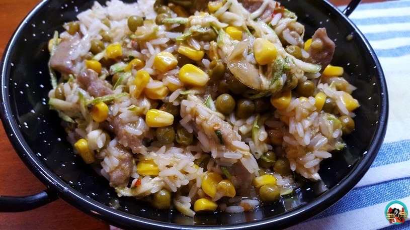 3.-En una sartén añadimos las dos cucharadas de cada una de las salsa. Añadimos las tiras de ternera y cocinamos 2 o 3 minutos. Introducimos los guisantes escurridos y el maíz escurrido, lo cocinamos todo 2 minutos más. Mezclamos la salsa con la ternera y las verduras con el arroz, y el calabacín rallado. Lo condimentamos con el orégano y el tomillo y servimos enseguida.
