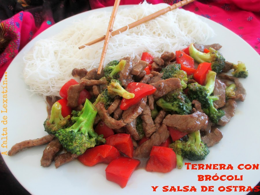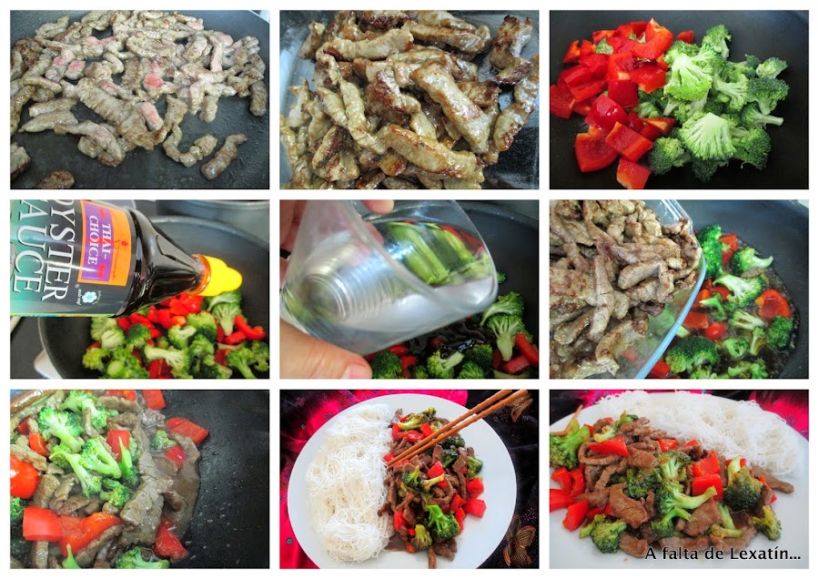 Añadir la salsa de ostras y el agua y cuando empiece a hervir agregar la carne reservada