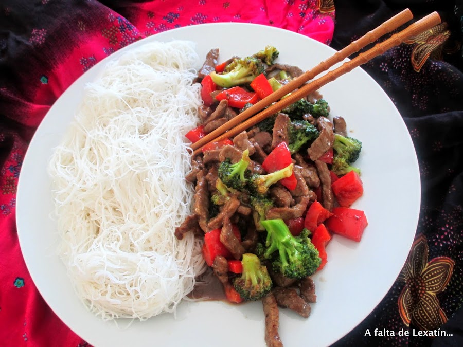 Poner la carne, cortada en tiras, en un bol y añadir los ingredientes de la marinada ( Salsa de soja, vino, "5 especias chinas", cayena y maizena). Remover todo y dejar reposar al menos 30 minutos