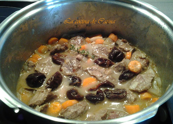 En una cazuela con aceite de oliva, doramos la carne junto a las verduras a temperatura media, añadimos la harina, mezclamos bien y freímos durante unos segundos, añadimos el líquido de la maceración con las ciruelas, el agua y las hiervas aromáticas. Salpimentamos y dejamos cocer durante 20 minutos o hasta que la carne esté tierna.