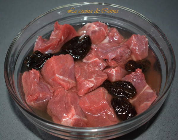 La noche anterior a la preparación, ponemos la ternera a macerar con las ciruelas y el vino blanco.