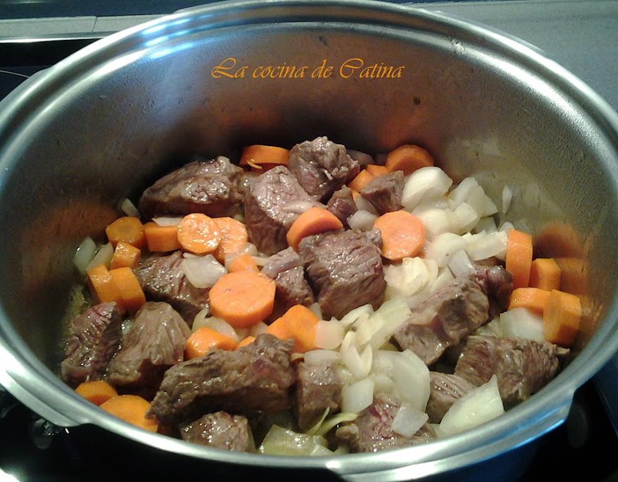 Al día siguiente sacamos la carne. Picamos la cebollo y las zanahorias en dados.
