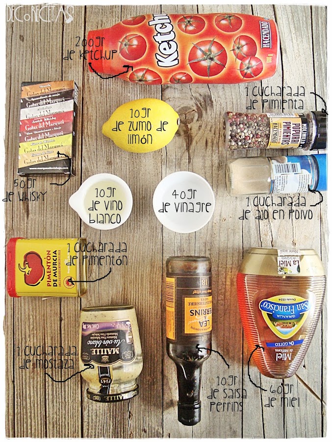Primero preparamos la salsa, mezclando todos los ingredientes y triturándolos a la vez. Posteriormente ponemos a fuego bajo y dejamos reducir. En mi caso, la hice en la thermomix programando 8 minutos, a 100º y velocidad 2 sin cubilete.