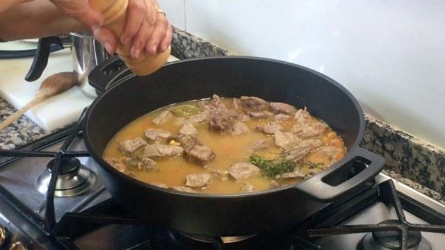 Taparemos la cazuela y cocinaremos la carne con el fuego bajo. Hay que ir comprobando que no falte caldo. Si es necesario le añadimos agua pero siempre muy caliente.