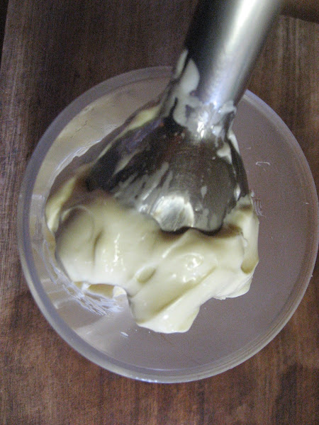 4º " Hacemos una mayonesa, como? muy sencillo, ponemos en un vaso para el caso un poco de sal, el aceite de girasol y el huevo. Comenzaremos desde abajo con la batidora en una marcha rápida y sin parar para nada, apretamos el botón y comenzará a espesar la mayonesa, cuando suba por encima de las hélices de la batidora y muy lentamente vamos subiendo, poco a poco hasta que lleguemos al borde del aceite, agitamos un momento y listos, ya tenemos mayonesa.