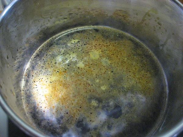2º " En este mismo caldo colocaremos los puerros troceados y los huesos de ternera. No tenemos ni puerros ni huesos, nada cogemos dos pastillas de caldo de carne y se las añadimos al caldo de las setas, listo, ya tenemos el caldo de carne.