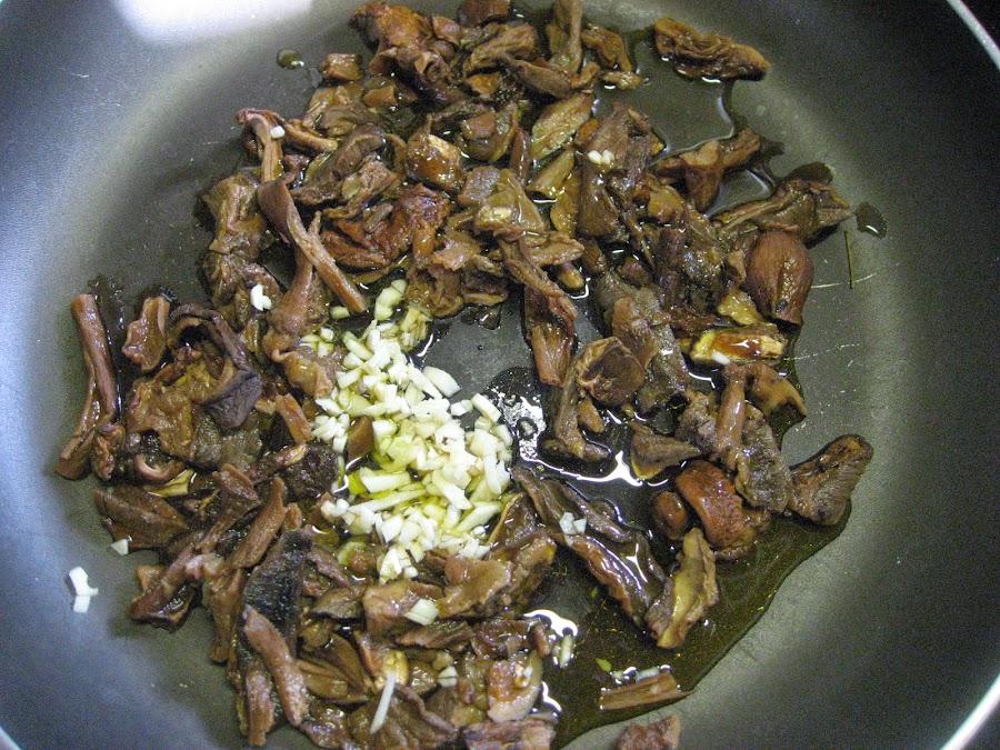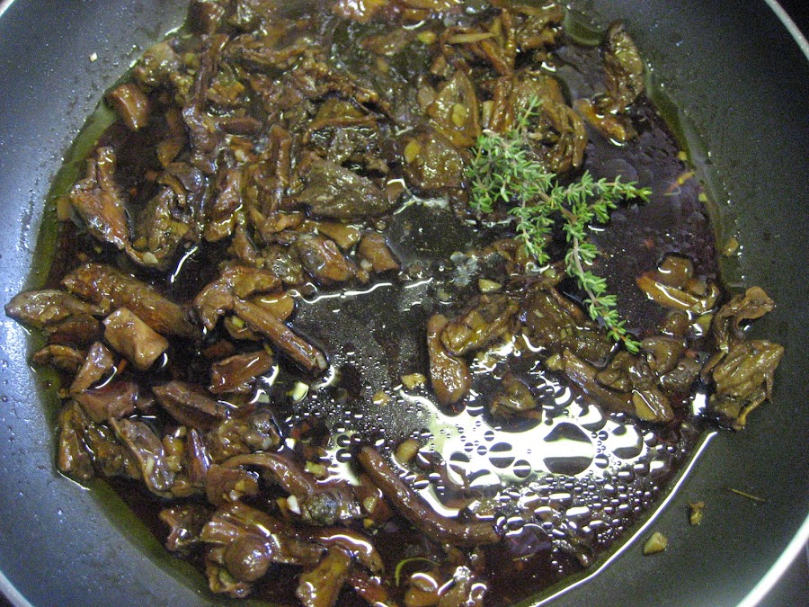 3º " Cogemos las setas y las ponemos en la sartén para darles un toque, le añadimos los ajos troceados pequeños, el tomillo y un poco de orégano seco, cinco minutos y ya las tenemos, ya las podemos triturar con la batidora y un poco de caldo de carne, reservamos la salsa.