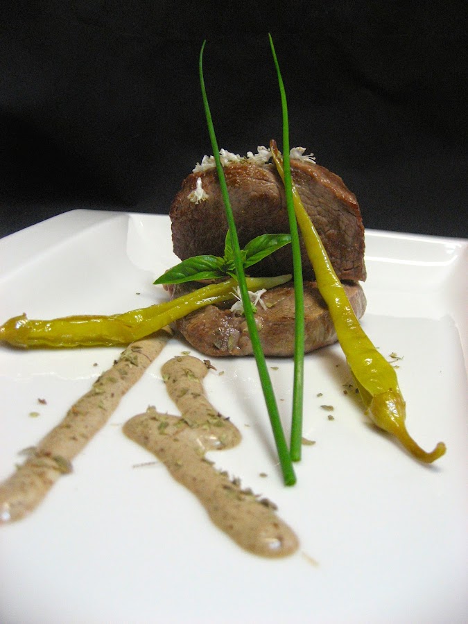 5º " Freímos en la plancha los filetes y las guindillas, a poder ser naturales, no de bote, los dejamos al gusto de cada uno y ya los tenemos.