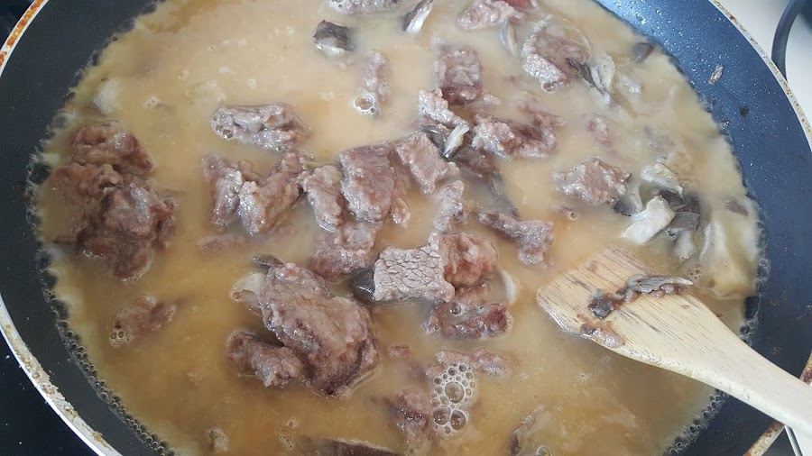 Juntamos la ternera con la setas y agregamos la salsa. Dejamos unos minutos a fuego bajo hasta que espese.