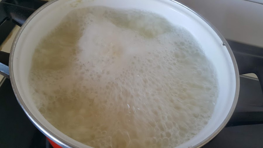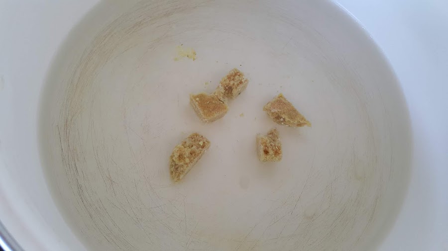 Mientras se cocinan las setas ponemos un cazo con 2 vasos de agua al fuego y añadimos el cubo de caldo de verduras concentrado y lo dejamos disolver.