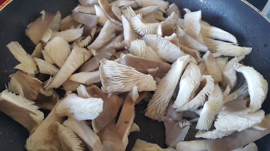Reservamos la ternera y en la misma sartén cocinamos las setas cortadas en tiras.