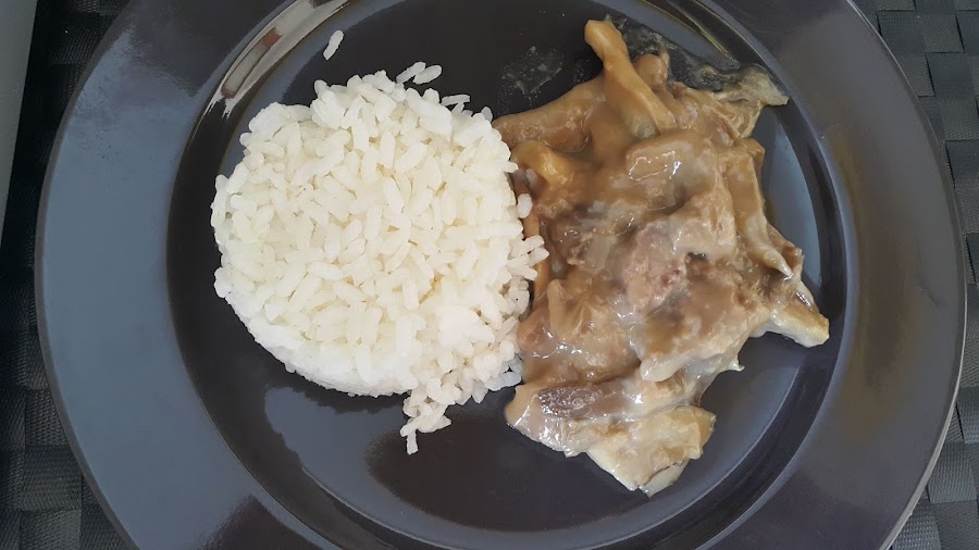 Ya sólo queda emplatar: ponemos un poco de arroz junto con la carne y las setas.