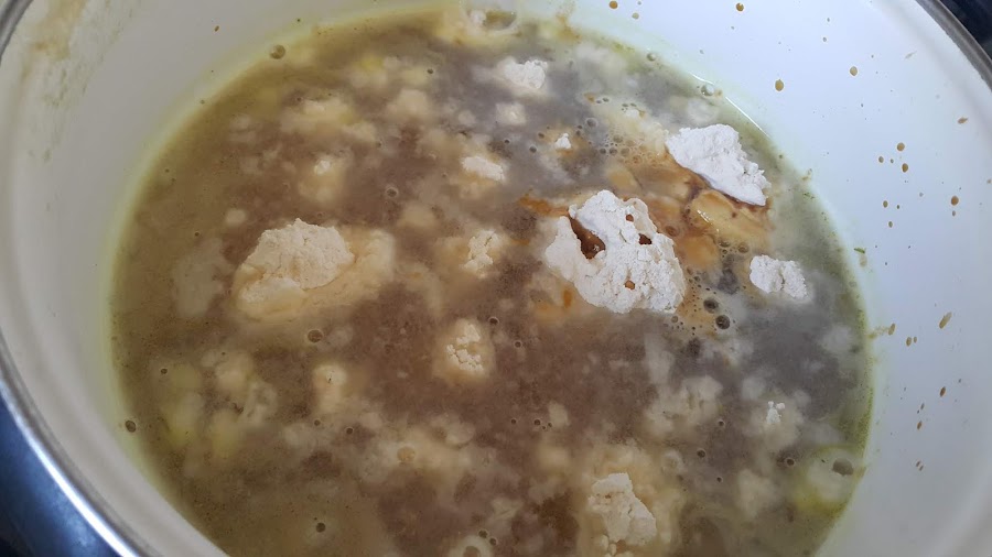 Cuando rompa a hervir apagamos el fuego y añadimos 2 cucharadas soperas de harina y una de salsa de soja. Removemos con unas varillas hasta conseguir que se homogeneice todo por completo.