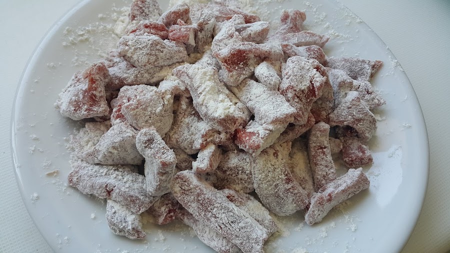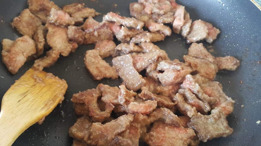 Cortamos la ternera a trozos, más o menos del tamaño de un bocado, y la enharinamos.