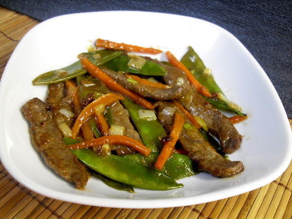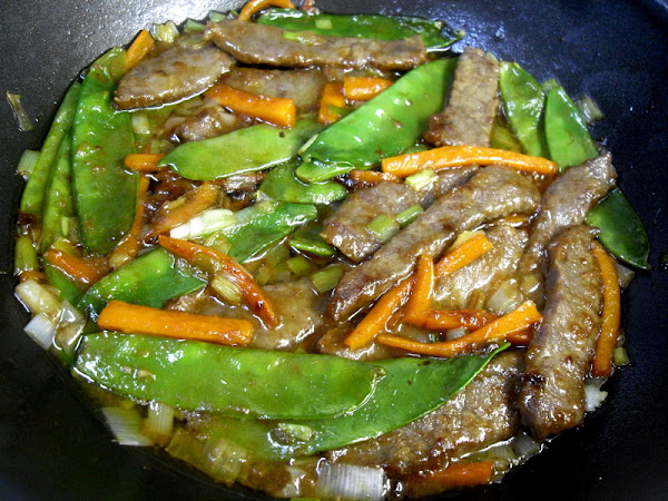 Calentar el resto del aceite y rehogar la zanahoria un 4 de minutos removiendo, añadir los tirabeques, agregar el azúcar, sal al gusto, y rehogar 3 minutos. Añadir la ternera y las 4 cucharadas de agua, mezclar todo con cuidado, cocinar 2 minutos y apartar.
