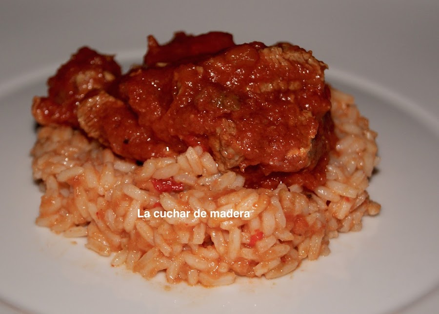 Ponemos una base de arroz y encima la carne en salsa