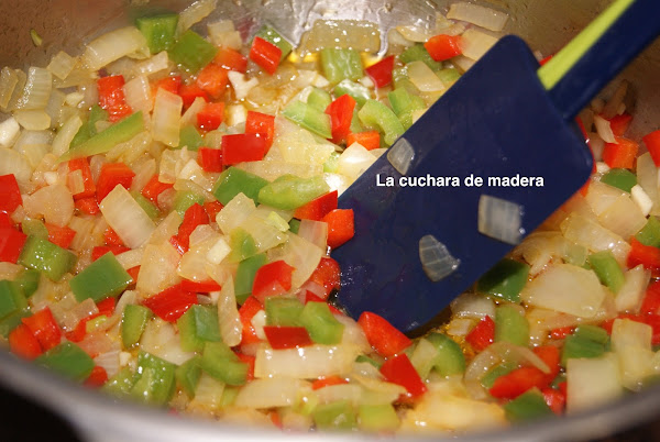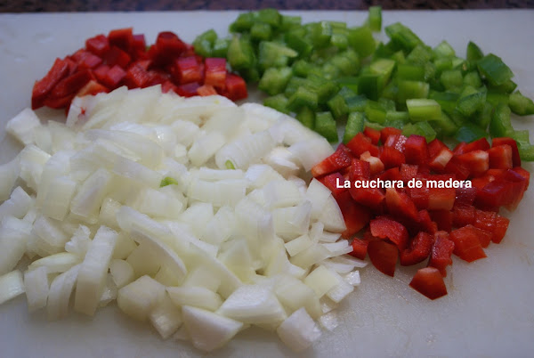 Pelamos la cebolla y los ajos, lavamos los pimientos rojo y verde y cortamos en trozos pequeños.