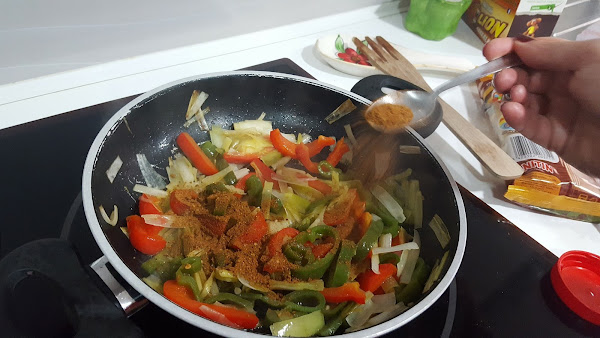 5.- Añadimos las especies picantes y mezclamos bien las verduras.
