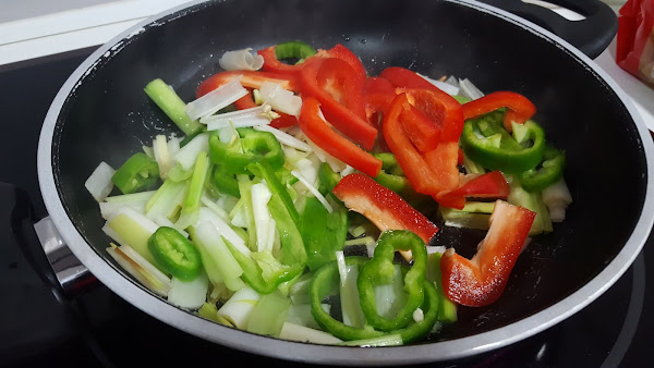 2.- Lavamos bien las verduras y las escurrimos. Los pimientos los cortamos en juliana y el puerro a tiras no muy largas. Reservamos.