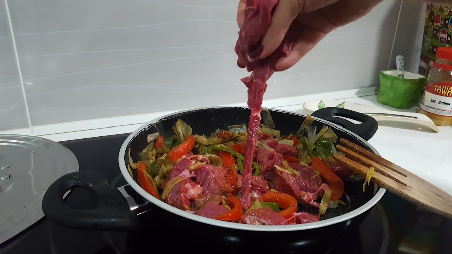 6.- Después añadimos las tiras de ternera y las mezclamos bien con las verduras para que cojan el punto de las especies.