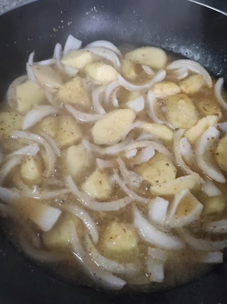 Cortamos la cebolla en juliana, pelamos y cortamos la patata en trozos pequeños. En la misma sartén de la carne, rehogamos dos minutos la cebolla y la patata, añadimos la cebolla en polvo y el ajo en polvo, mezclamos y añadimos el agua. Dejamos dos minutos más al fuego.