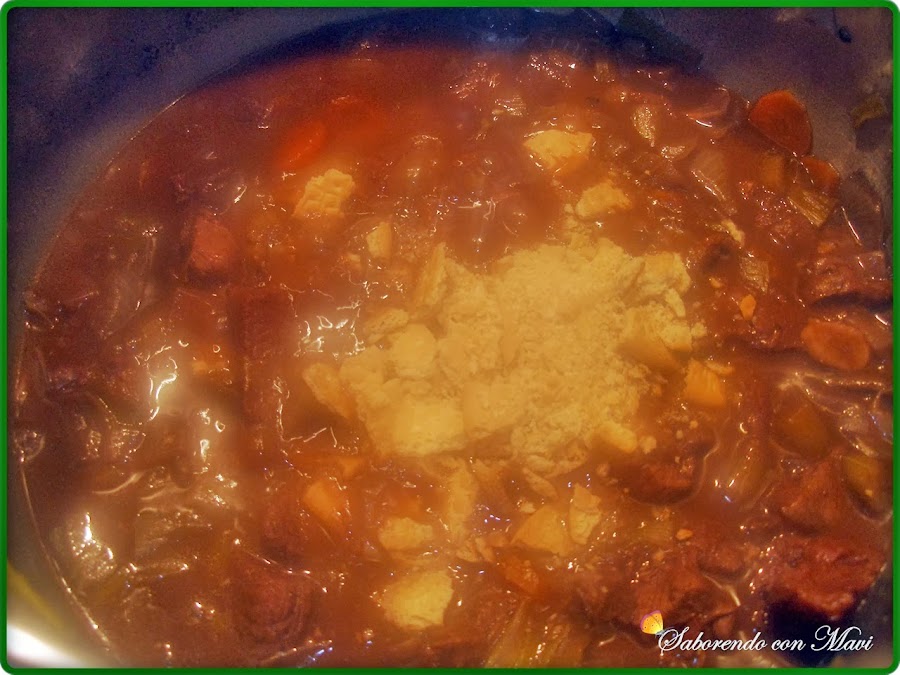 Destapamos y le añadimos las galletas,( bueno, si vemos que se quedó un poco seco le añadimos un poco más de agua )y lo ponemos destapado a pochar unos 5 minutos más.