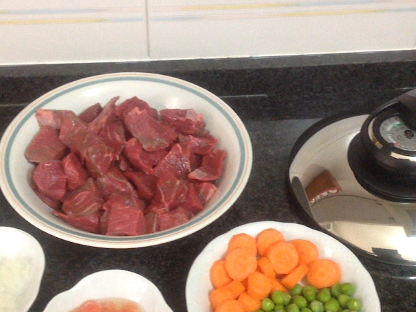 a) Lo primero que hay que hacer es poner a calentar una olla a fuego fuerte, en este caso nosotros utilizamos la de 3 litros; cuando la franja roja del "visiotherm" alcance la figura del "chuletón" entonces ponemos la ternera con sal y tapamos; esperamos a que la franja roja alcance el "98" y destapamos y damos la vuelta a la ternera, volvemos a tapar y a repetir esta misma operación dos veces más.