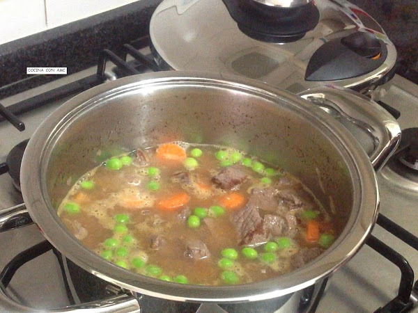c) Destapamos e incorporamos la zanahoria partida a rodajas y los guisantes, así como el vino blanco. Les damos unas vueltas mezclando todo bien y colocamos la tapa rápida.