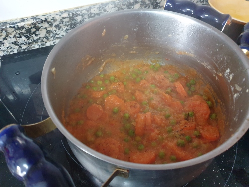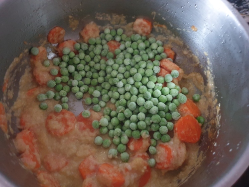 Una vez cocinado la zanahoria. añadimos los guisantes... Removemos y añadimos 1 cucharada de harina y removemos...