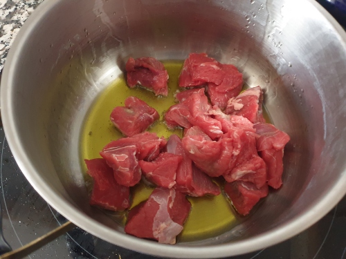 En una cazuela echamos aceite de oliva y sofreímos la ternera, sal a nuestro gusto y removemos