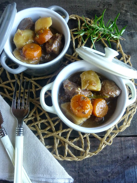 Me encantan los estofados hechos lentamente donde la carne queda tan blanda que se rompe casi con mirarla. Si además está acompañada de ricas patatas y zanahorias con todo el sabor de la salsa ya es de lo mejorcito. Pero para rematarlo, si la carne es tan buena como ésta de la vaquita de mi suegro, es para echar fuegos artificiales. Ternera 100% gallega.