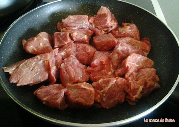 Calentar el aceite en una cazuela y freír los trozos de carne sazonados y ligeramente enharinados.