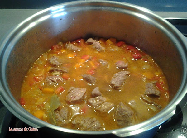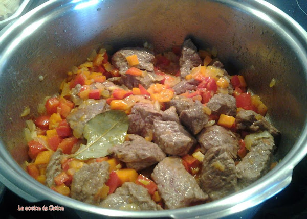 Al final incorporamos el tomate picado. Cuando la verdura esté pochada, ponemos de nuevo la carne en la cazuela, echamos el vino, la hoja de laurel y cubrimos la carne con agua si es para cocinarlo en olla rápida que lo tendremos unos 20 minutos. Si es en olla normal le ponemos 3 vasos de agua y cocemos a fuego lento durante una hora.