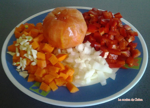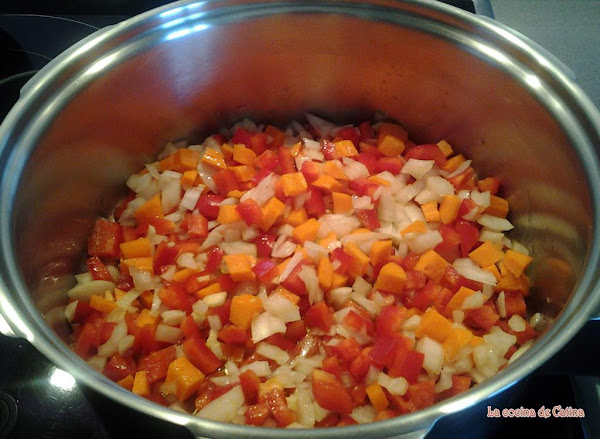 Una vez dorados los sacamos y los reservamos. En el mismo aceite, sofreímos el ajo, la cebolla, la zanahoria y el pimiento todo picado muy fino durante unos 10 minutos.