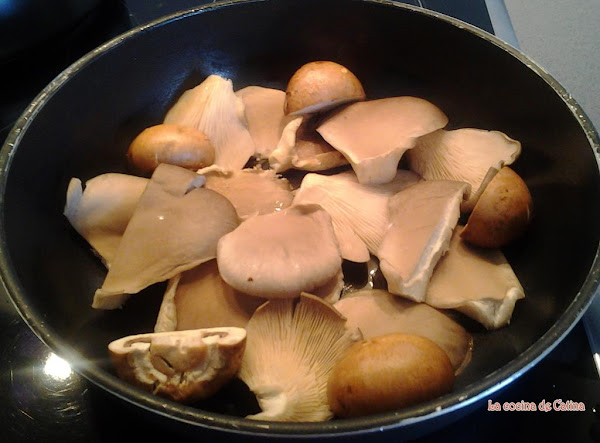 Limpiar y cortar en trozos las setas y freírlas ligeramente en una sartén aparte.